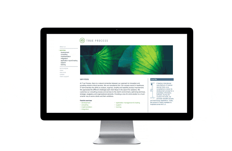 A nationwide team of consultants and engineers, True Process offers innovative ideas and practical solutions to the healthcare industry. We partnered with the experienced team to create a visually compelling brand identity by drawing parallels between two math-based systems: nature and technology. The result of our collaboration has helped propel the company to a 3-year growth of 4 million dollars in revenue at a rate of 245%* and a 300% increase in vital employees. True Process was sold to Baxter in 2019.